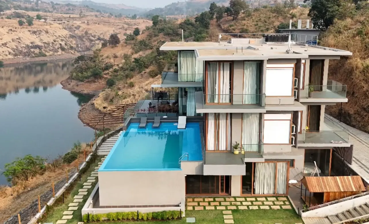 Today, that spontaneous idea stands proudly as a luxurious 5BHK holiday bungalow overlooking the stunning Bhavli Dam. Thoughtfully designed with heart (and plenty of coffee-fueled discussions), our home offers everything you’d want in a perfect getaway—an infinity pool, bathtubs in almost every bathroom, spacious interiors, and breathtaking 360° views of Igatpuri’s mountains and water bodies.