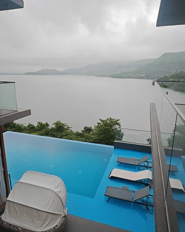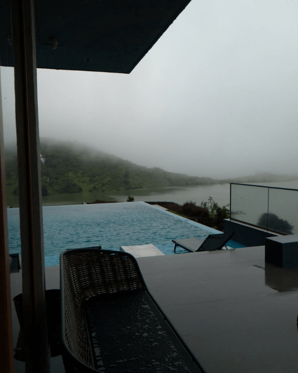 Dive into luxury with our private infinity pool that opens up to stunning views of Bhavli Dam and the surrounding mountains.